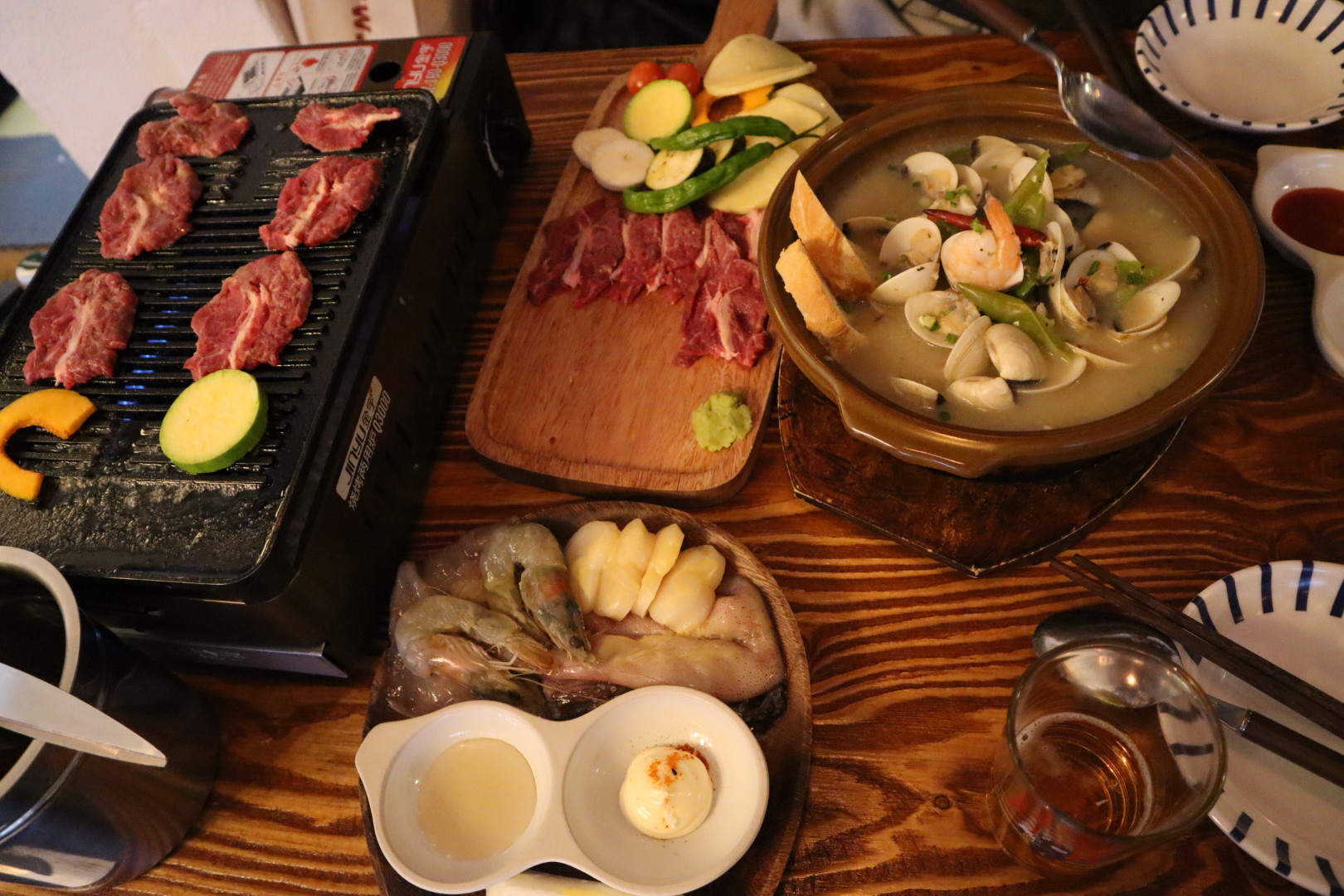 모듬야끼에는 소고기, 채소, 관자, 새우, 오징어가 나온다.