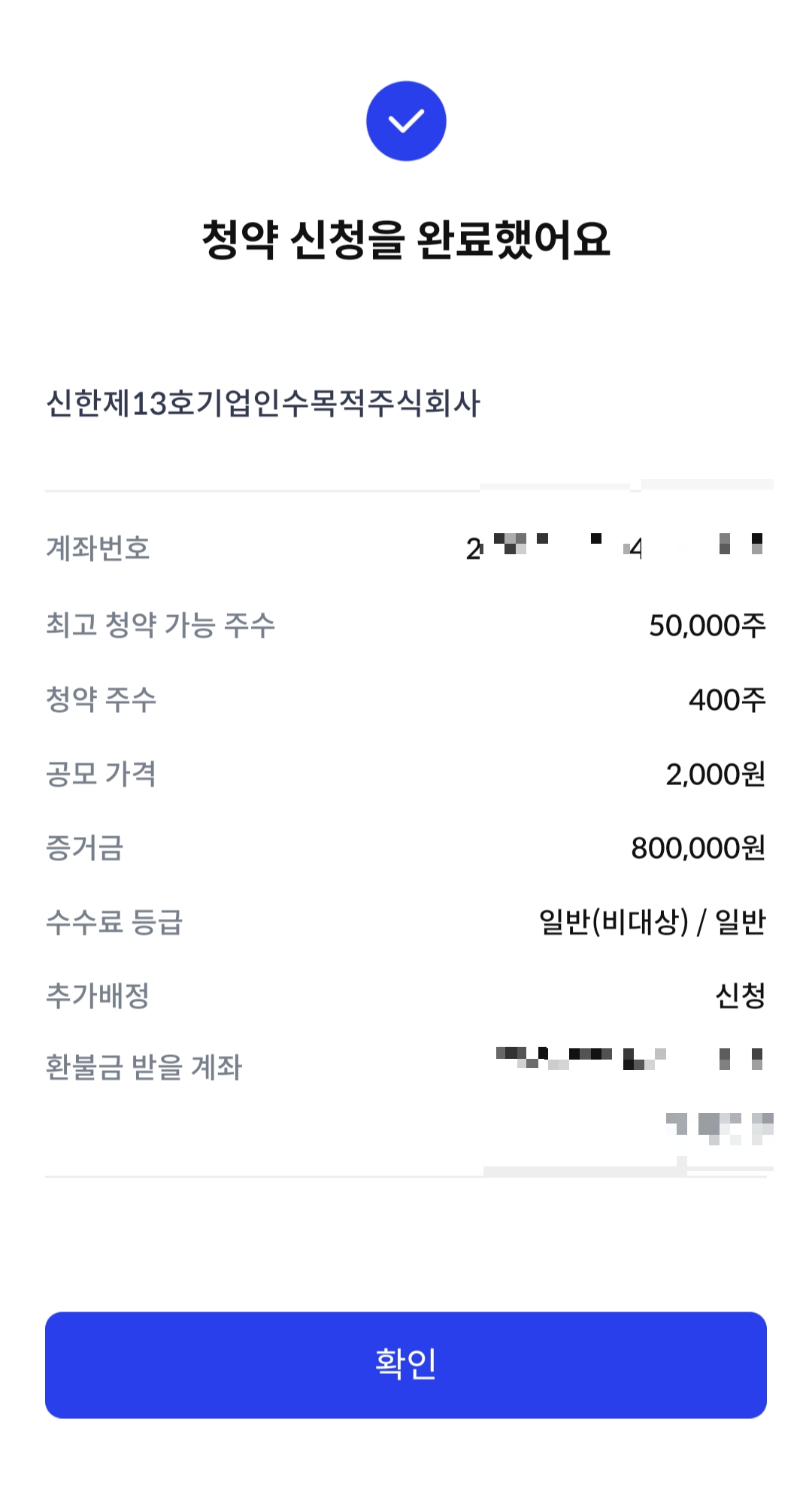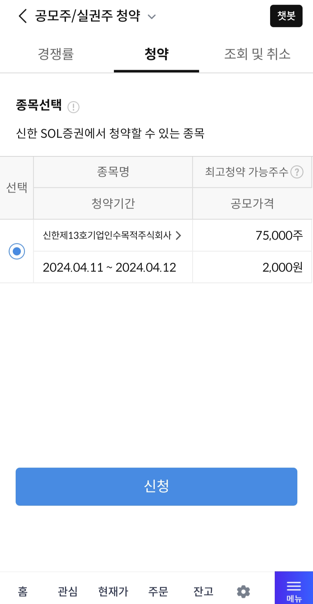 오늘은 신한스팩 제13호 공모주청약을 완료했습니다.