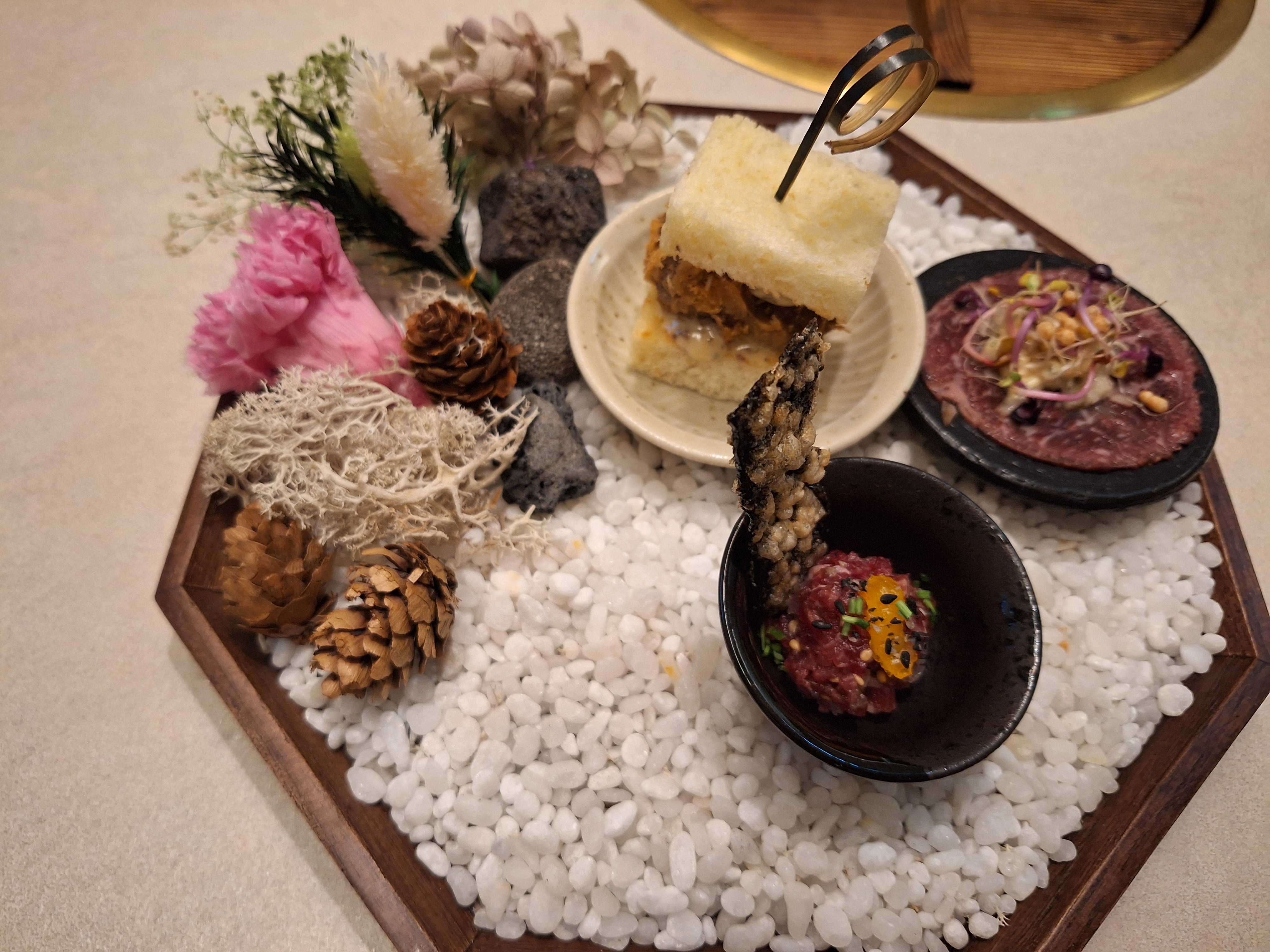 볏짚구이편채, 안심샌드, 육회와 김부각이에요.