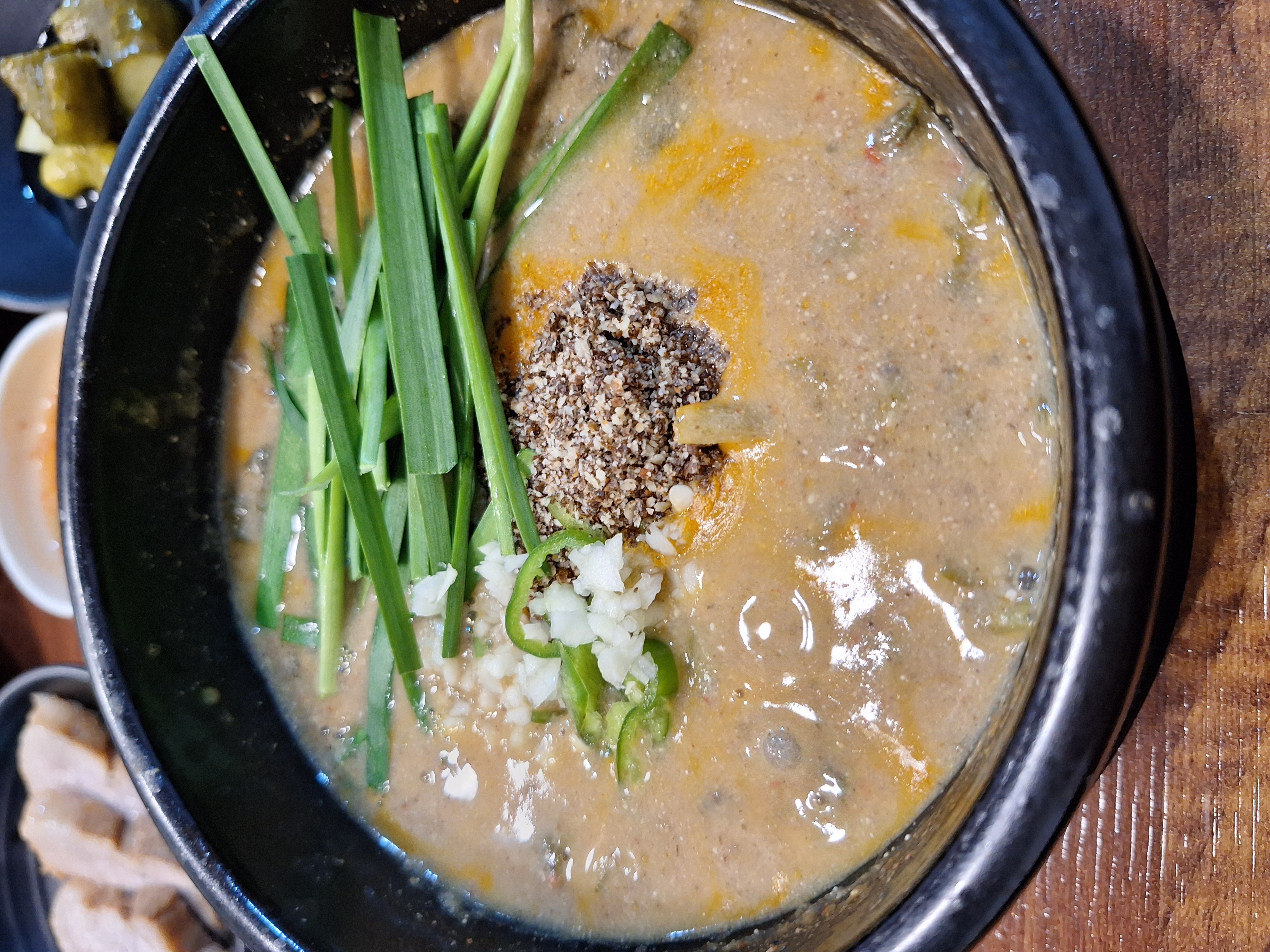 추어탕에 부추, 들깨가루, 고추, 다진마늘 넣고 먹으면 맛있어요.